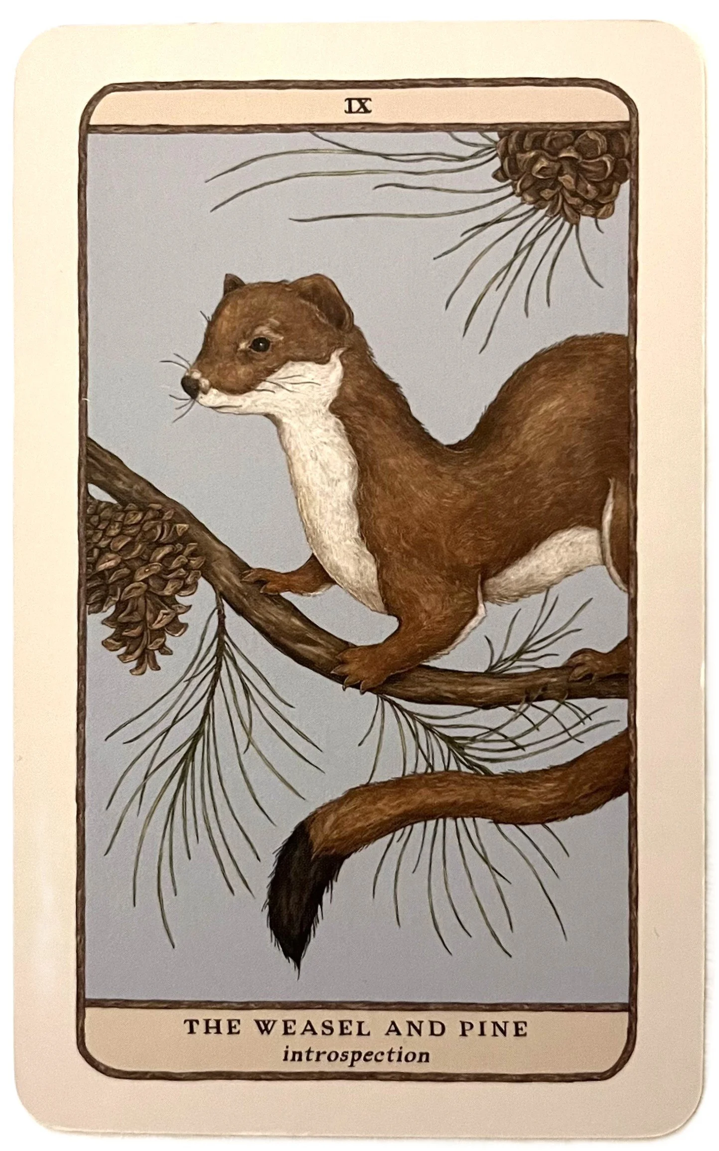The Weasel represents solitary self-sufficiency—it’s ok to spend some time alone and think about things—and Pine reminds us not to neglect the protections we may need (ie: boundaries).