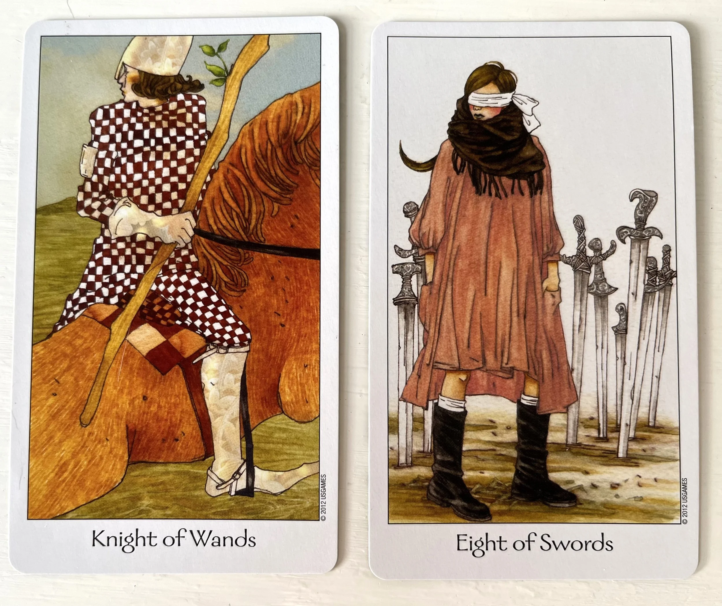 The tarot doesn’t clock gender (another interestingly open-ended attribute of its practice), and when we look at our clarifying cards—the Knight of Wands and the 8 of Swords—I have the sinking suspicion that these days, in my relationship, I’m the one giving off the energy of the Knight of Wands figure here. Revving to GO, with inspired action, with anything (look, I’ve started a tarot blog) in the pursuit of adventure, and I do seem to have endless ideas these days (although this figure also tends not to be everyone’s cup of tea).