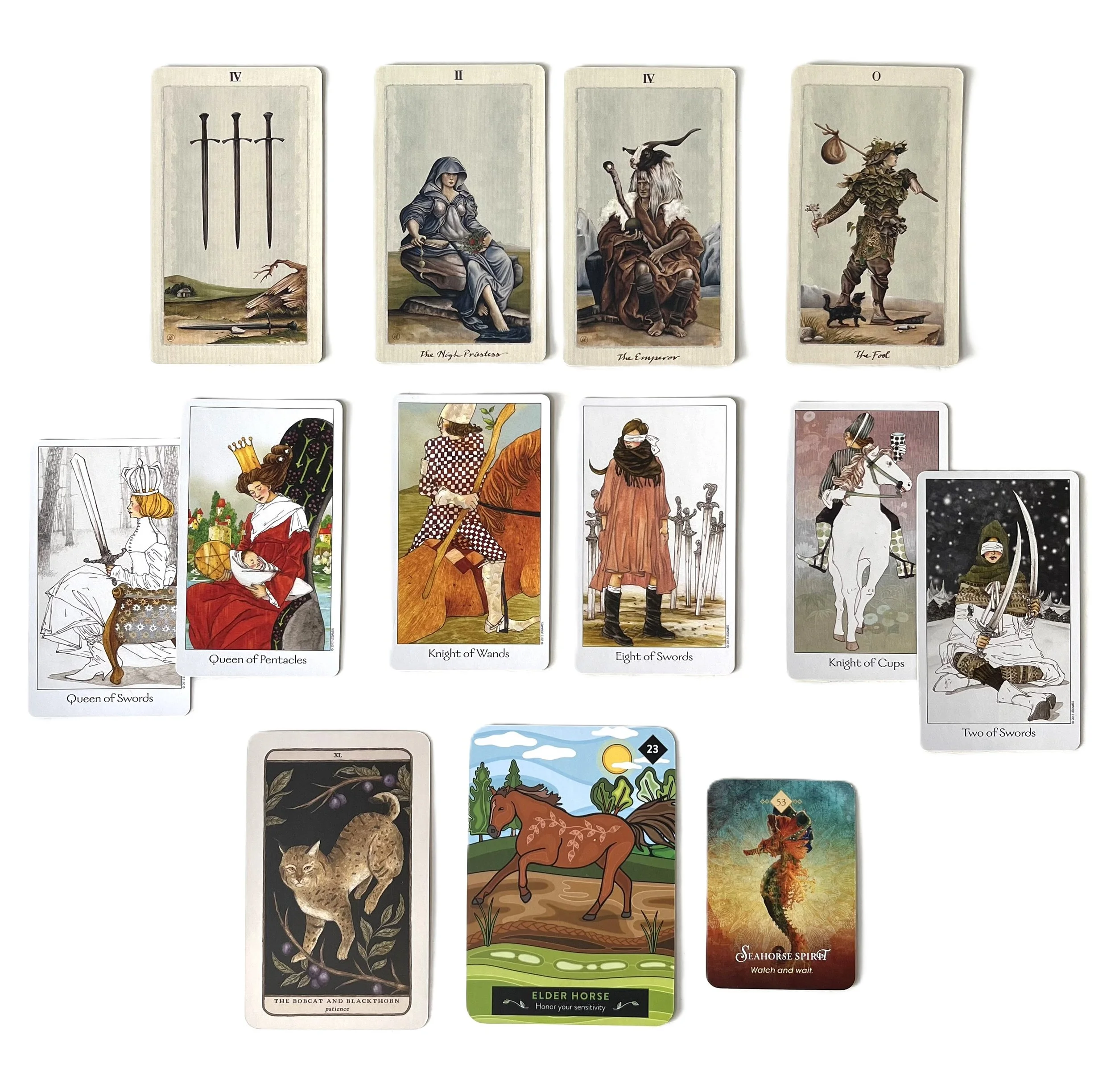 Then I clarify the first set of cards with a second row of cards, using a different tarot deck. In this reading these are from The Dreaming Way Tarot by Rome Choi and, again, if a few extra pop out, np. These cards flesh out the message of the first row.