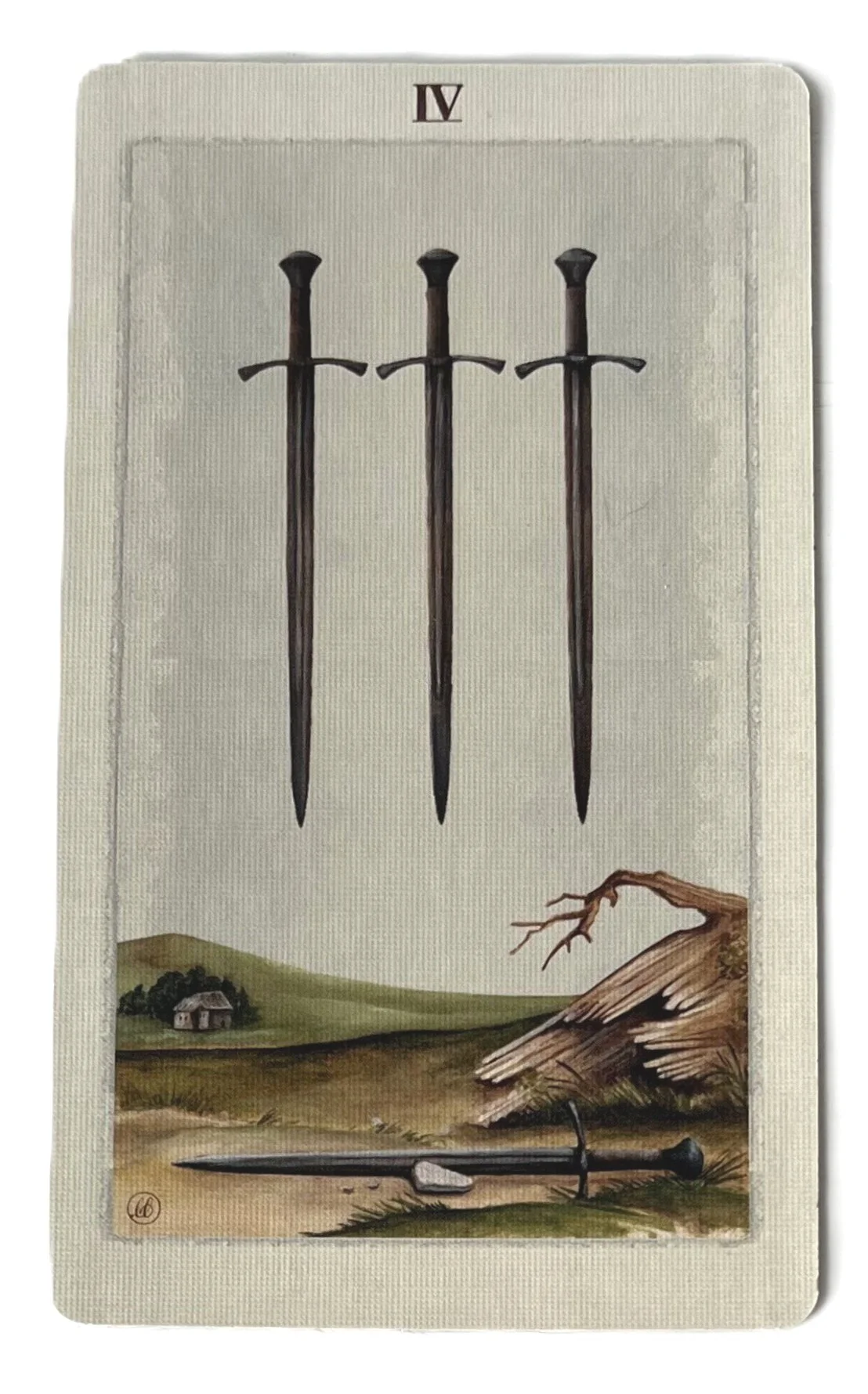 Three of Swords means loss, or the disintegration of what we ‘thought we had.’ That’s right, I said to myself dramatically as I pulled the rest of the cards. I was so sure disappointment was at the heart of EVERYTHING, cycling back again, that I completely missed the fourth sword (on the ground below).