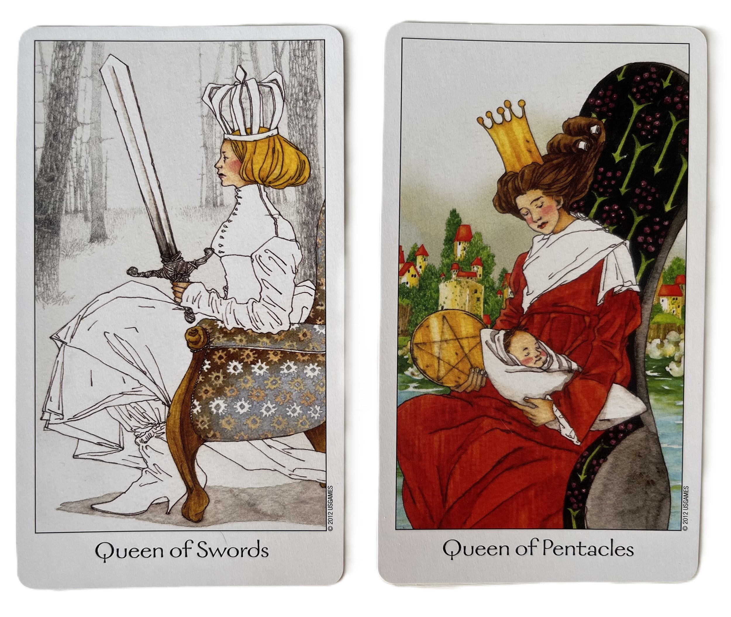 For me, for as long as I’ve been alive, I’ve identified with these two particular ladies, the Queen of Swords and the Queen of Pentacles, more significantly, in some frankenstein-ian mix of mostly ‘nerd’ and ‘mother.’